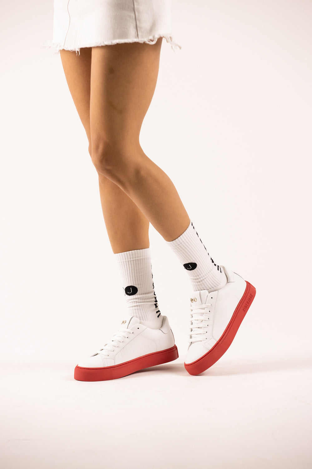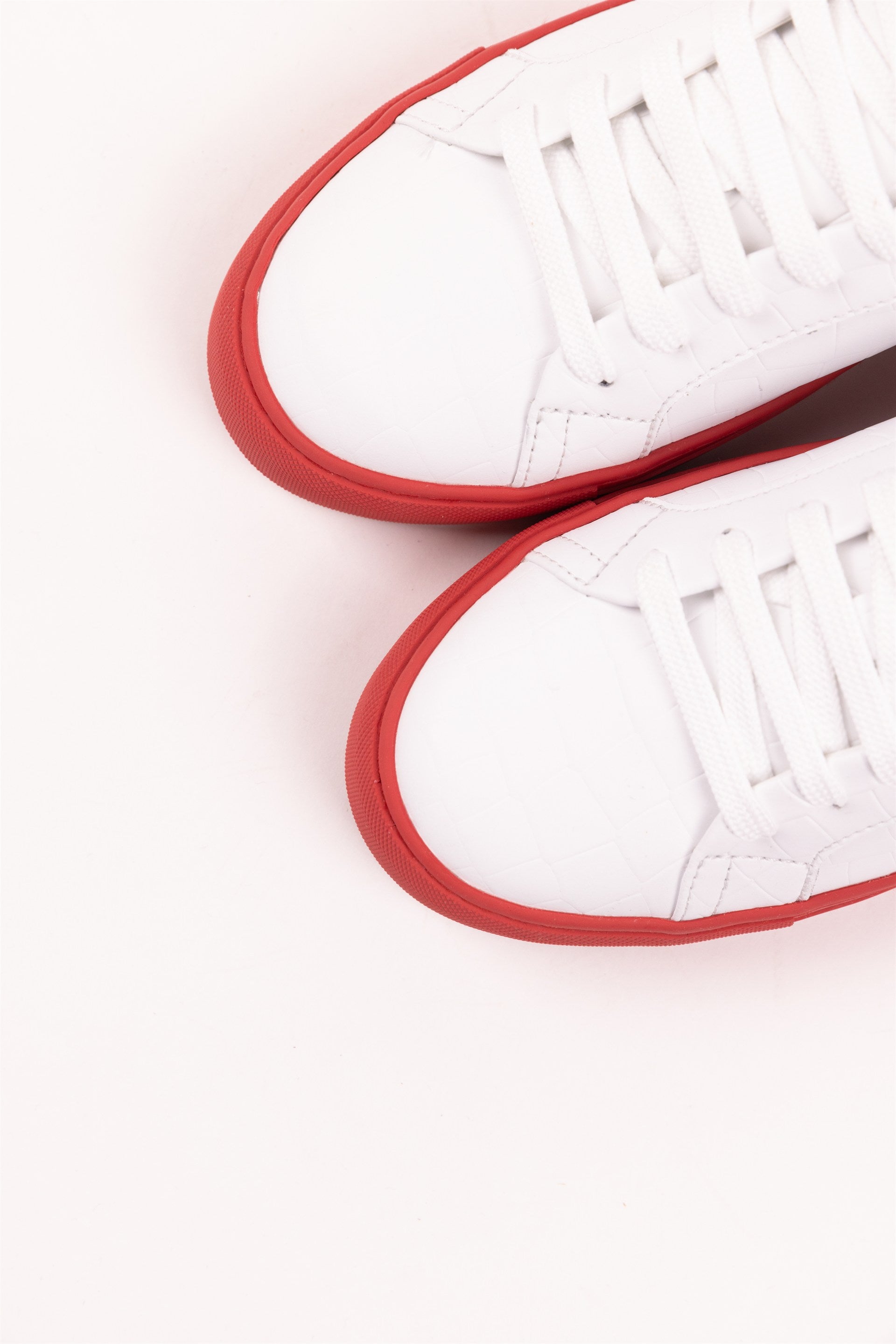 These designer sneakers are expertly crafted using 100% action leather. These sporty and elegant sneakers feature a golden logo, tone-on-tone laces, and an iconic red bottom, making them a standout addition to any shoe collection. With their classic white and red colorway, these sneakers are the perfect combination of style and versatility.