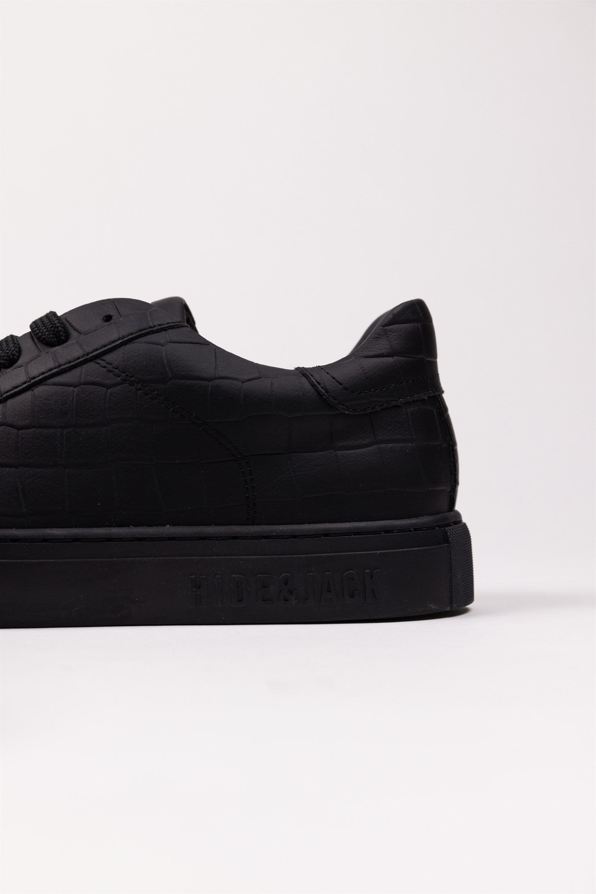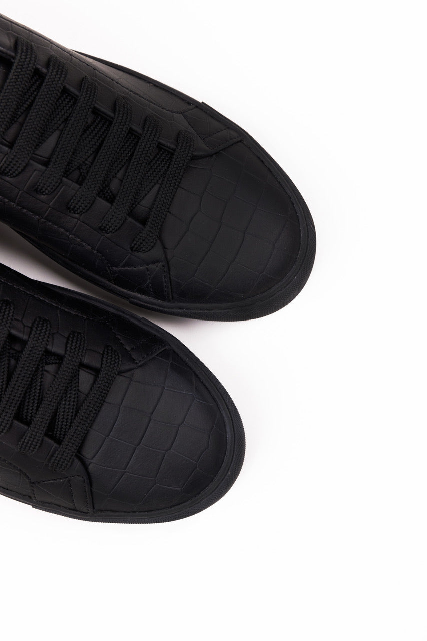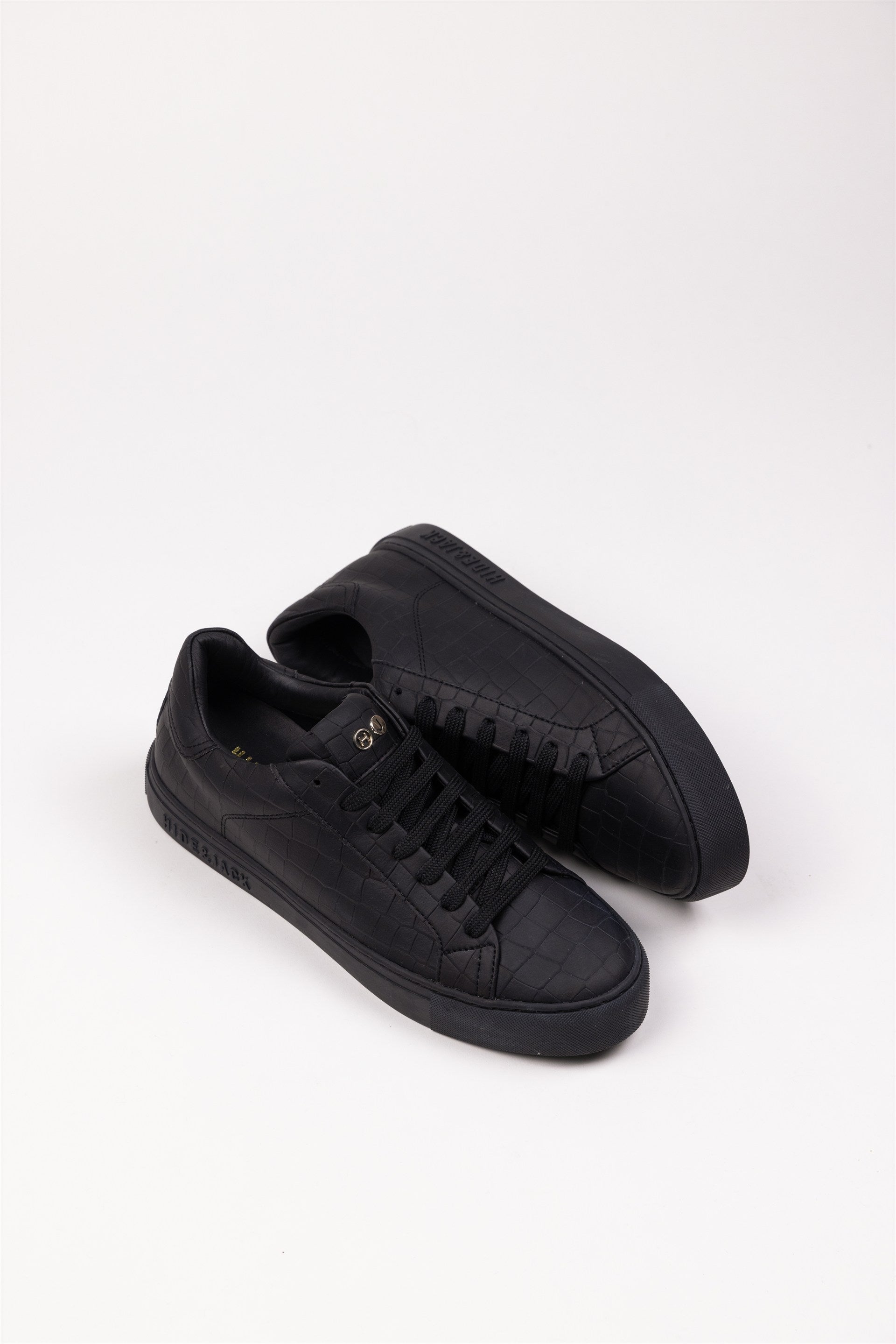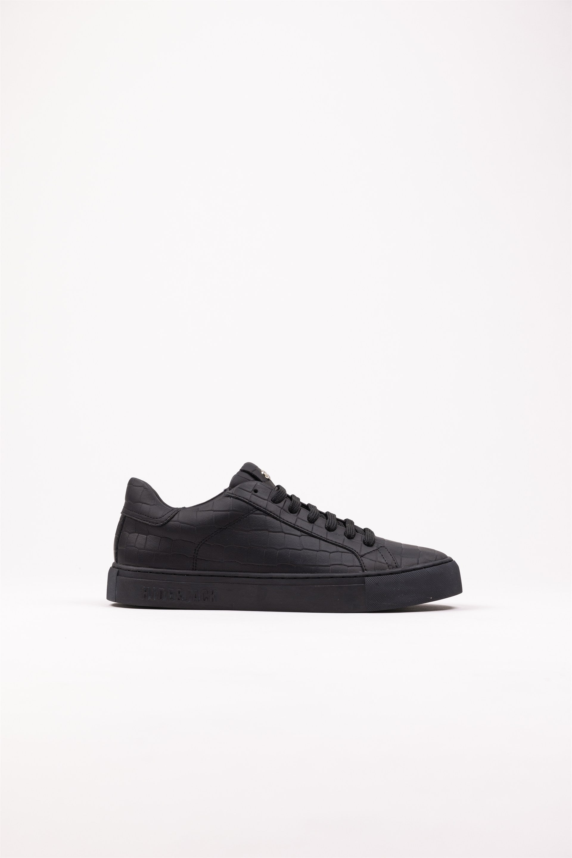 This Italian designer sneaker features a sleek calf leather material with a unique croco pattern, all in a classic and sophisticated all-black colorway. Designed in Italy with the utmost attention to detail, these low rise sneakers exude a sense of elegance and luxury. The tone on tone laces add a subtle touch of refinement to the overall design, while the double personality of this shoe allows it to be both sporty and versatile for any occasion.
