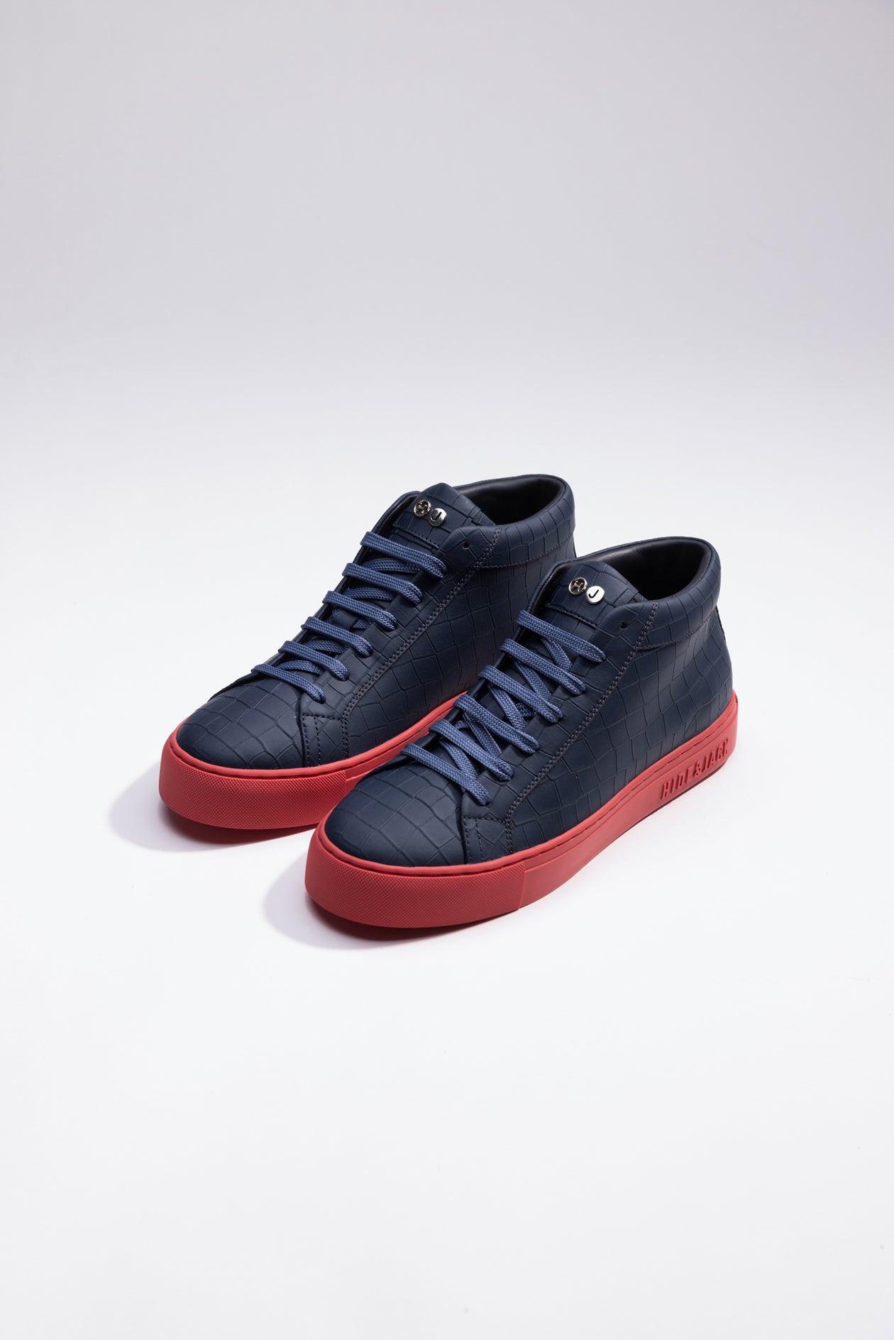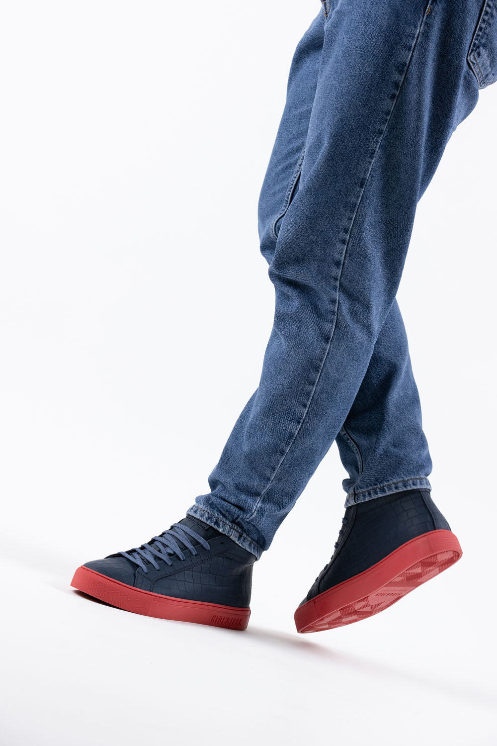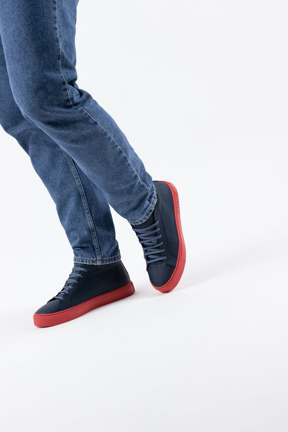 These are our Essence High Top sneakers in blue and red. Designed in Italy with 100% calf leather and featuring our iconic red sole, these sneakers are the perfect balance of luxury and style. The croco pattern adds an extra touch of sophistication to the already elegant design, while the high rise provides both comfort and support.