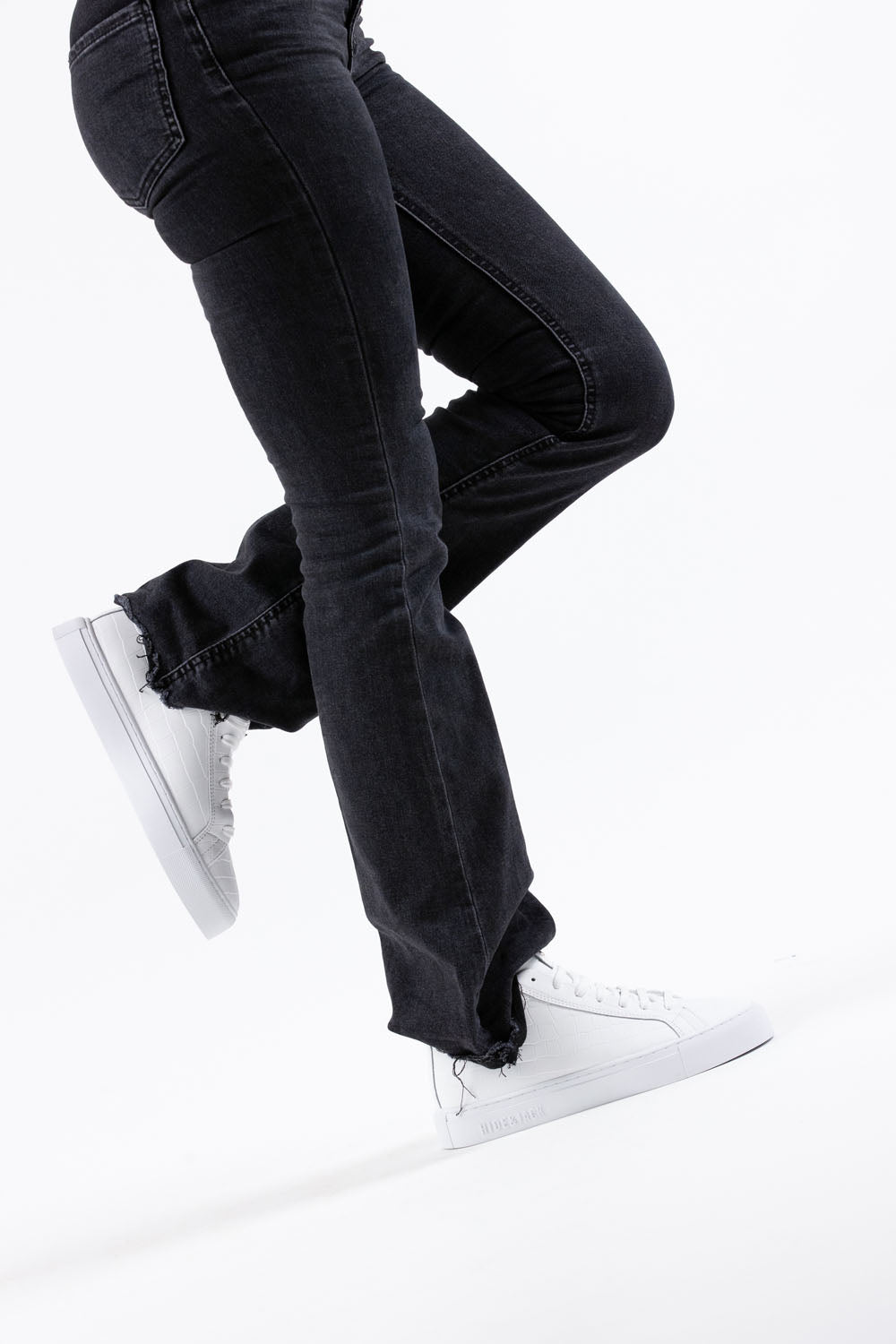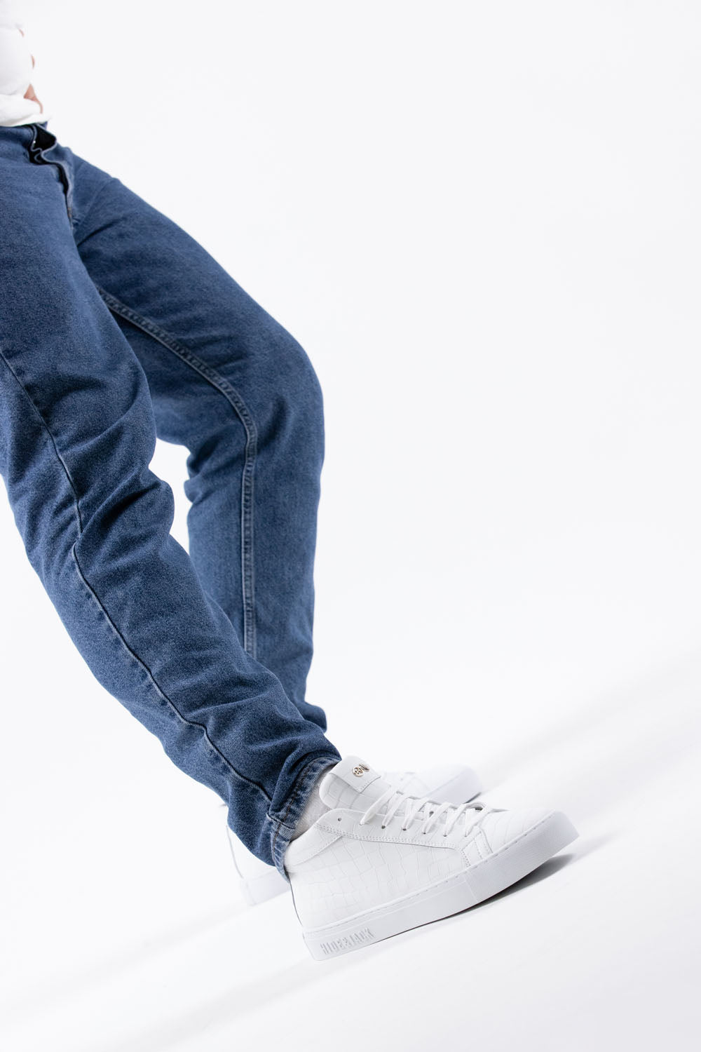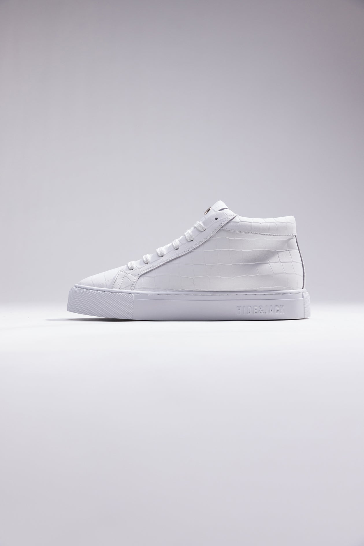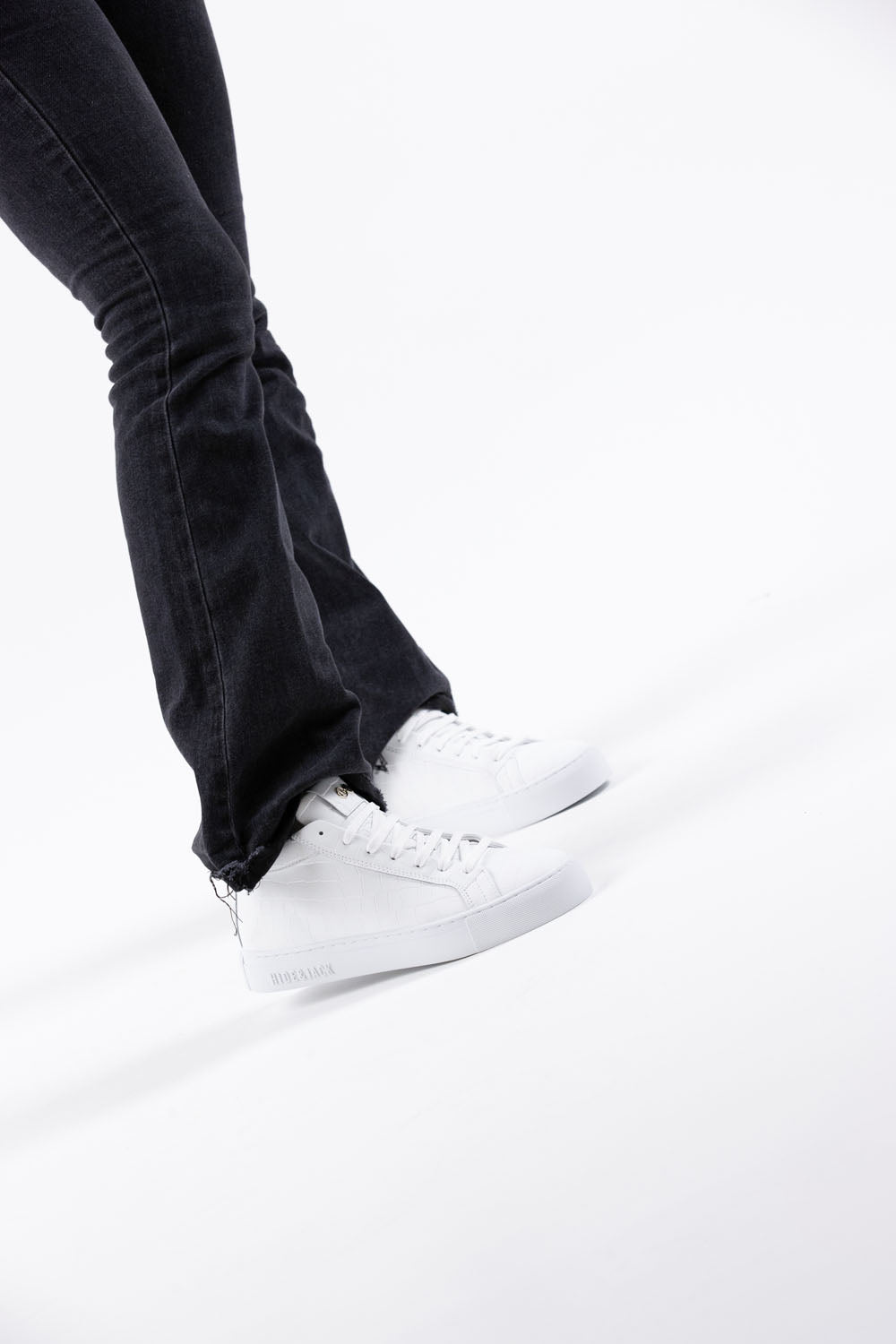This is the Essence Tuscany high-top white sneaker version. Crafted from 100% nubuck leather and designed in Italy, this sneaker boasts a high-rise design that exudes elegance. Its all-white color scheme, from the upper to the sole, is complemented by the subtle tone-on-tone laces, creating a refined aesthetic.