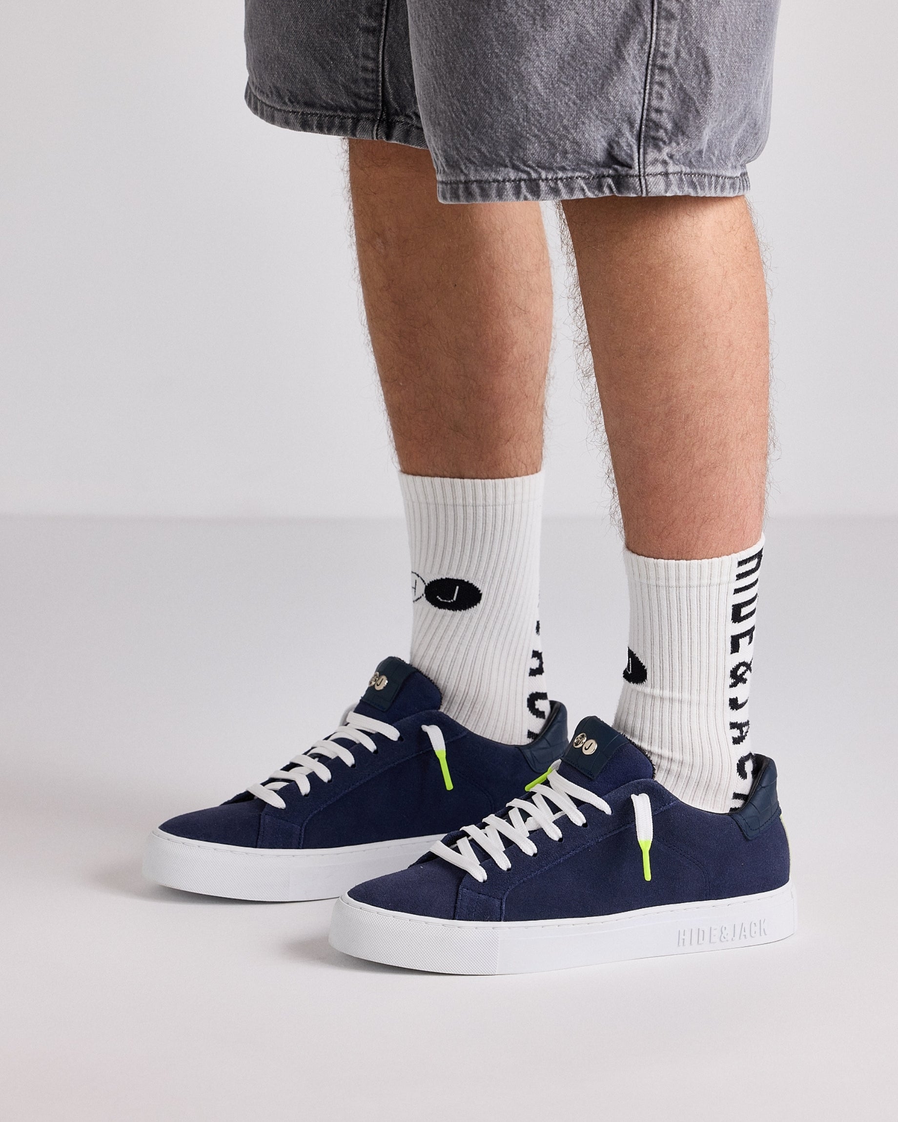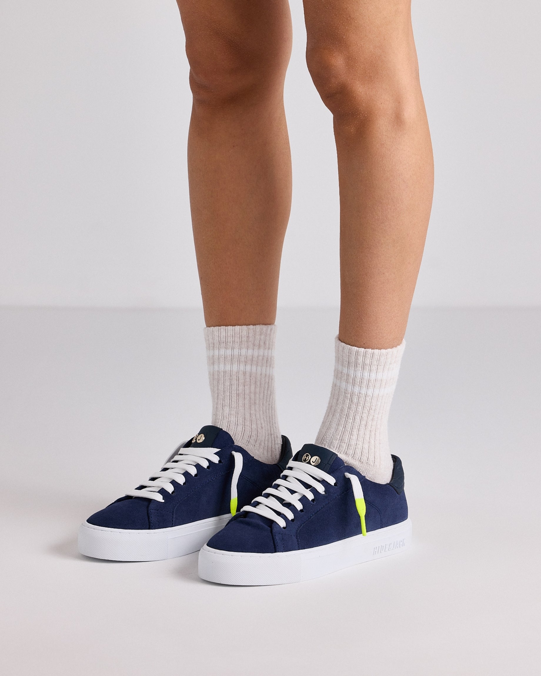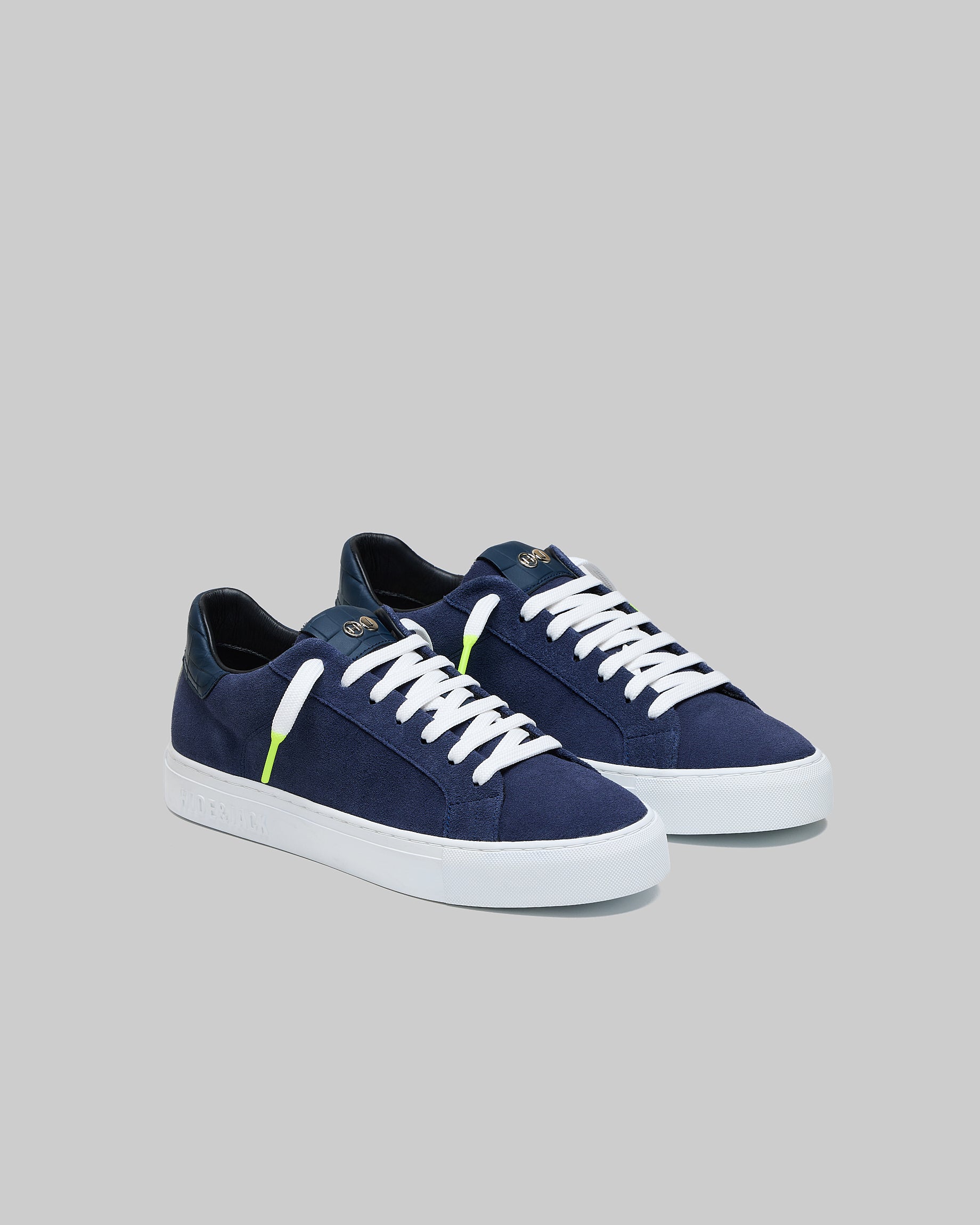 Inspired by the late 70's, these designer shoes are the perfect combination of style and quality. The blue upper is paired with our iconic bottom in white. The upper is made of 100% suede leather mixed with sponge, while the lining is crafted from 100% calf leather, ensuring unbeatable comfort and durability. The tone-on-tone laces and rubberized yellow details add a touch of sophistication to these striking sneakers.