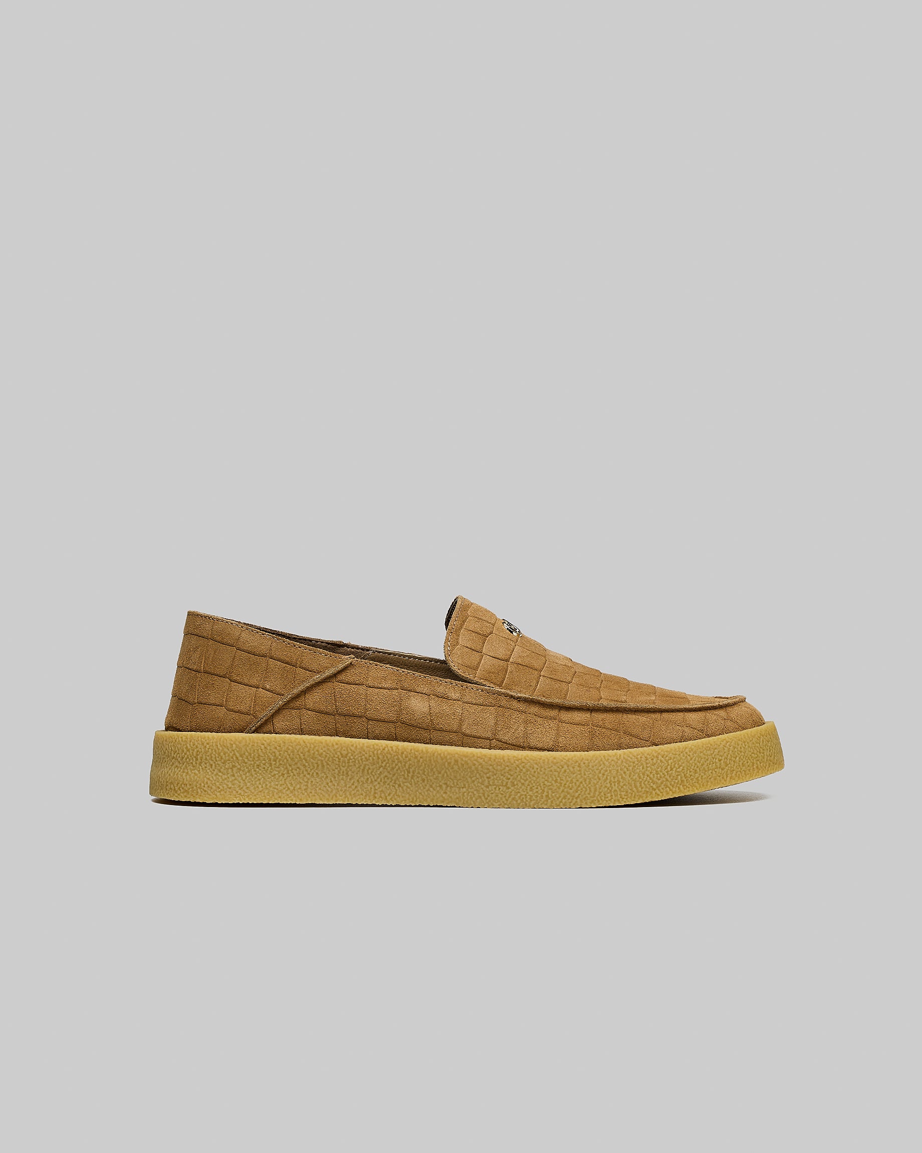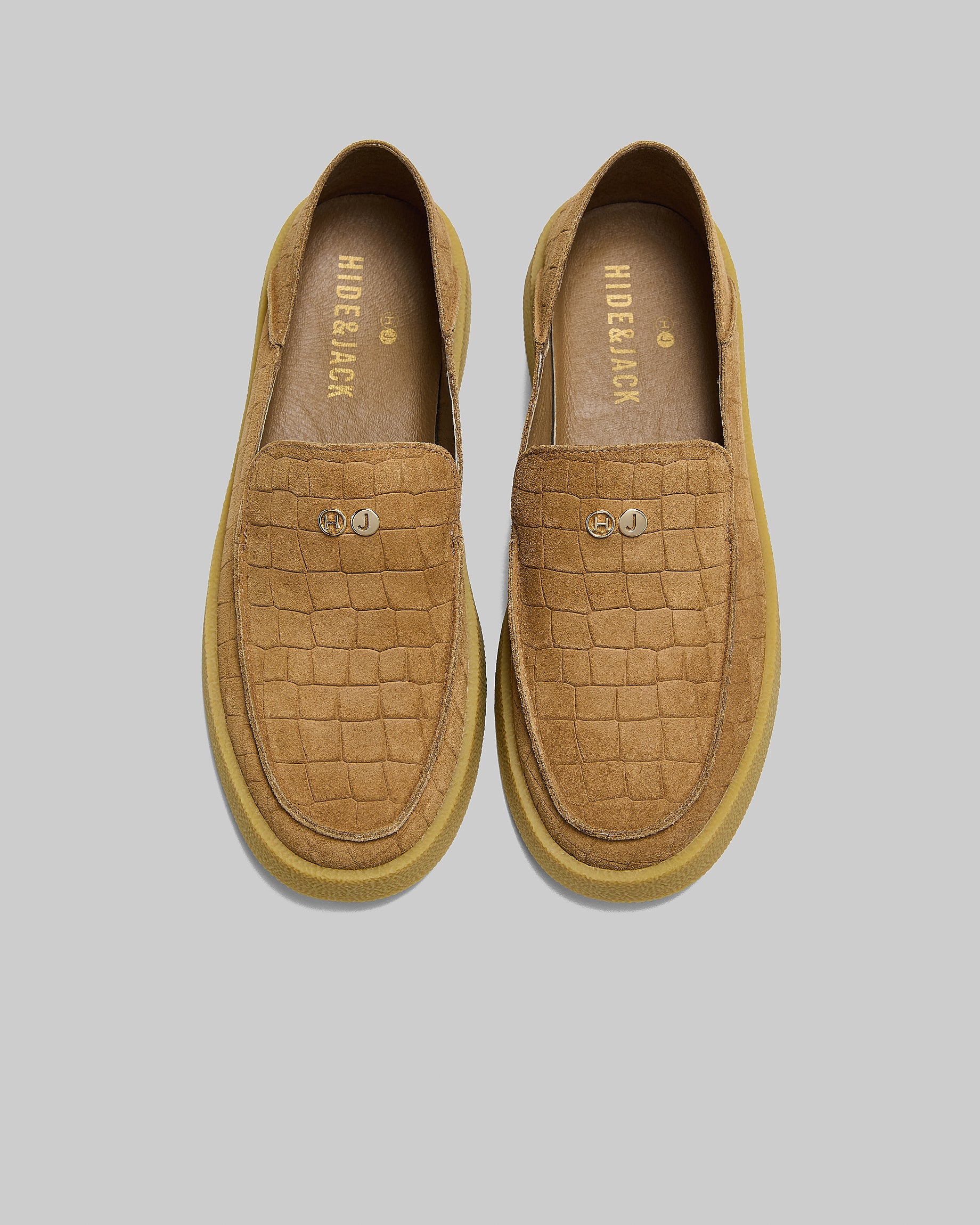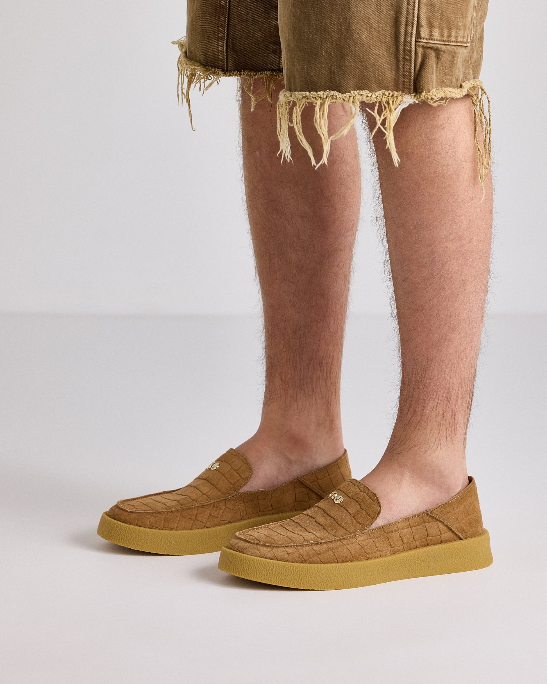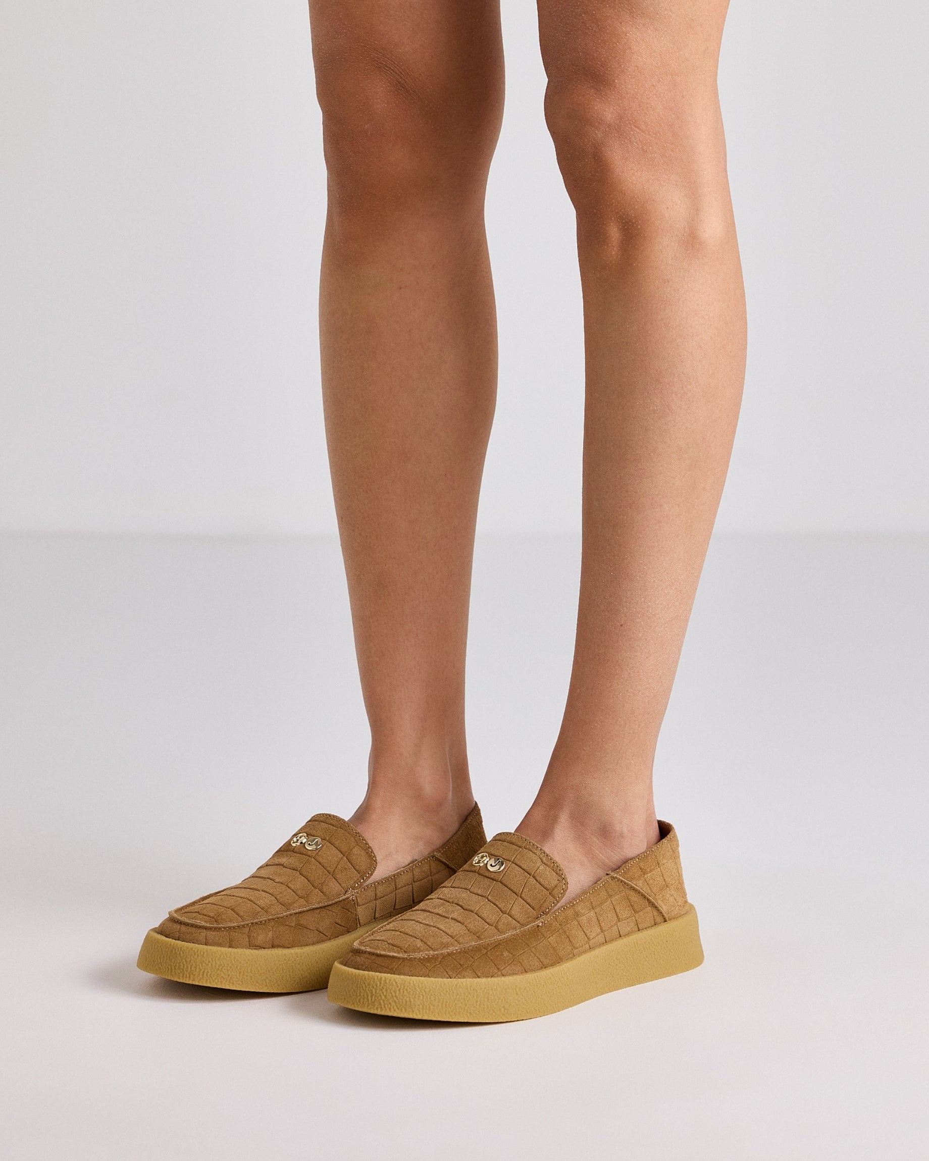 A summer slip-on in unlined croc suede, soft and lightweight.